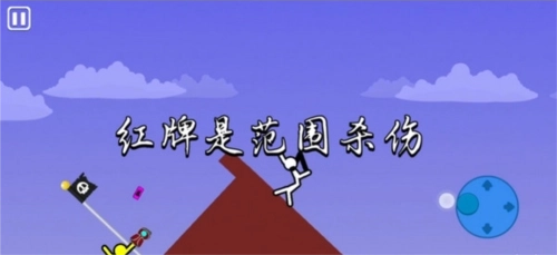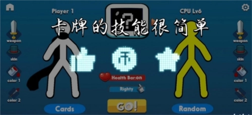 1、这个火柴人决斗者会随机切换卡牌,我们得记住每张卡牌的效果,其中绿色卡牌的作用是束缚对手的武器。
