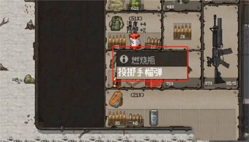 2、燃烧瓶的合成公式是威士忌照明弹,也就是说玩家将威士忌放到照明弹上面,就可以获得燃烧瓶了。