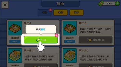 2、拥有足够多的货币后,点击建造即可建造餐饮、客舱以及各种娱乐设施,注意有些建造需要达到相应的等级要求。