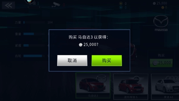 4、当你开车在练习阶段赢了的话,第一部需要选车,在展示厅中用硬币购买自己第一辆车到自己的车库里面。