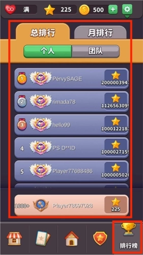 6、进入【排行榜界面】后,能查看【总排行榜】、【月排行榜】、【个人排行榜】以及【团队排行榜】的相关信息。