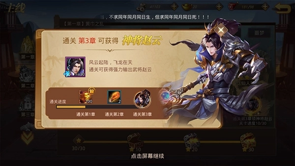 3、玩家通过前三个章节的关卡后,就能获取神将赵云,拥有赵云后,过图基本就没什么压力了!