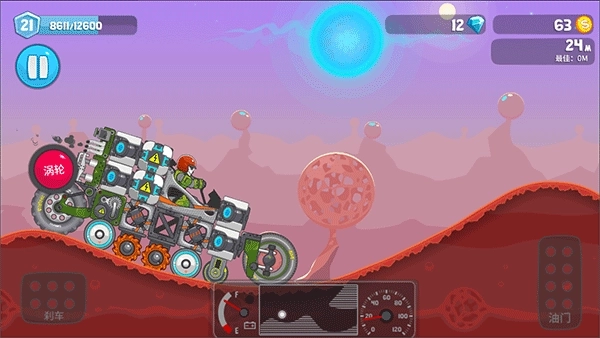 4、轻松有趣的平衡操控玩法,主角面无表情地驾驶红色小车,在各种险峻路面上极限驰骋。