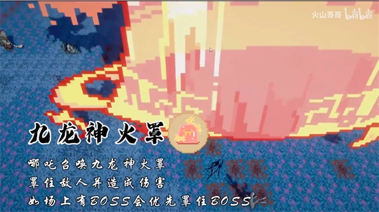 哪吒施术唤出九龙神火罩,瞬间将敌人围困在罩内,神火持续对其灼烧。倘若场上有BOSS现身,此罩便会率先锁定BOSS。