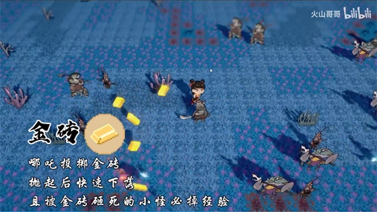 哪吒抛出金砖,金砖于空中短暂停留后即刻飞速下坠,凡是被击中的小怪,必定会掉落经验值。