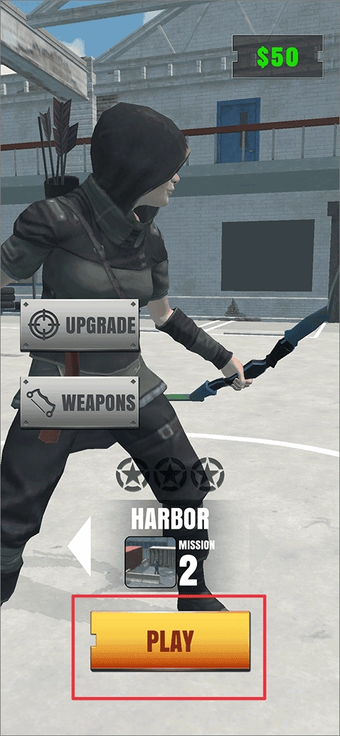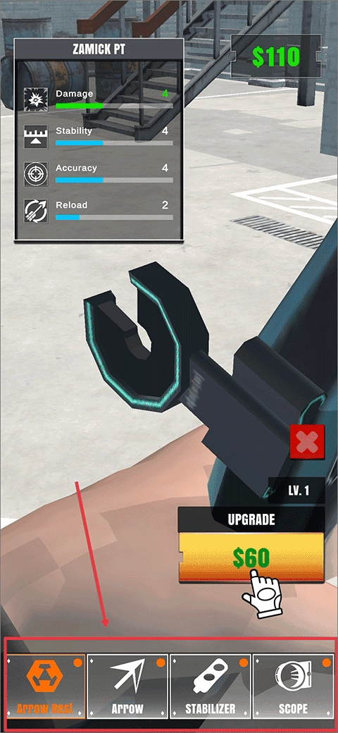 4、在游戏的开始界面,找到“UPGRADE”选项,通过它你能够对弓箭上的各个配件进行升级。