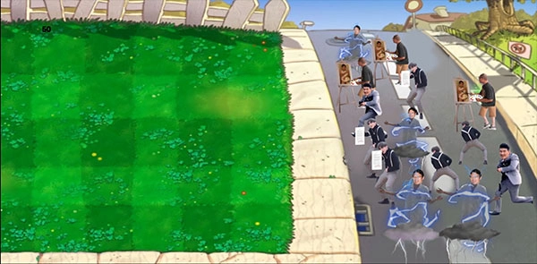 2、可以看到熟悉的植物大战僵尸场景画面,不同的是右侧的僵尸们都变成了全明星。
