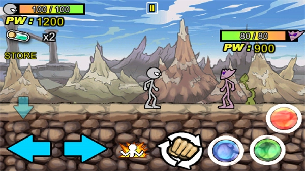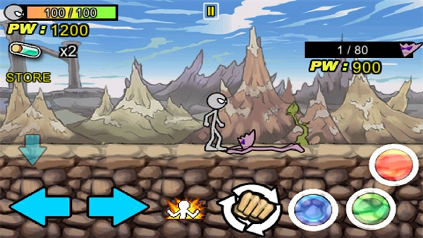 右侧最上方的按键是跳跃键,最左侧的按键可发动脚部攻击,其旁边的按键则能使用拳头攻击。