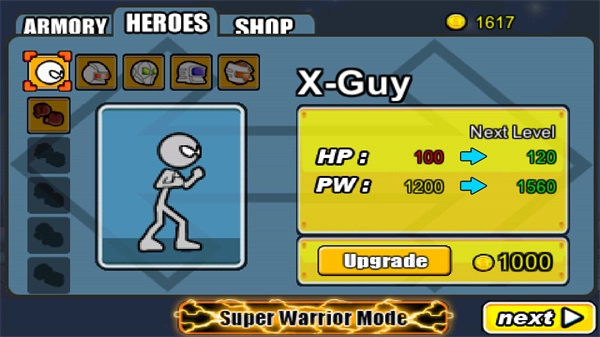 3、不同类型的火柴人都有,可以灵活的选择,然后就能开启最刺激的闯关。