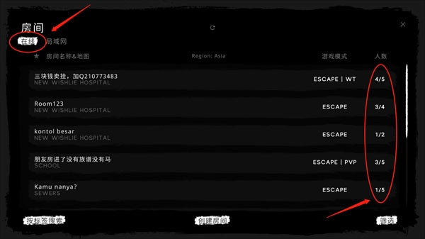2、在【房间】界面里,能看到其他玩家创建的房间,随便点击其中一个,就能和其他游戏玩家一起畅快游玩啦。